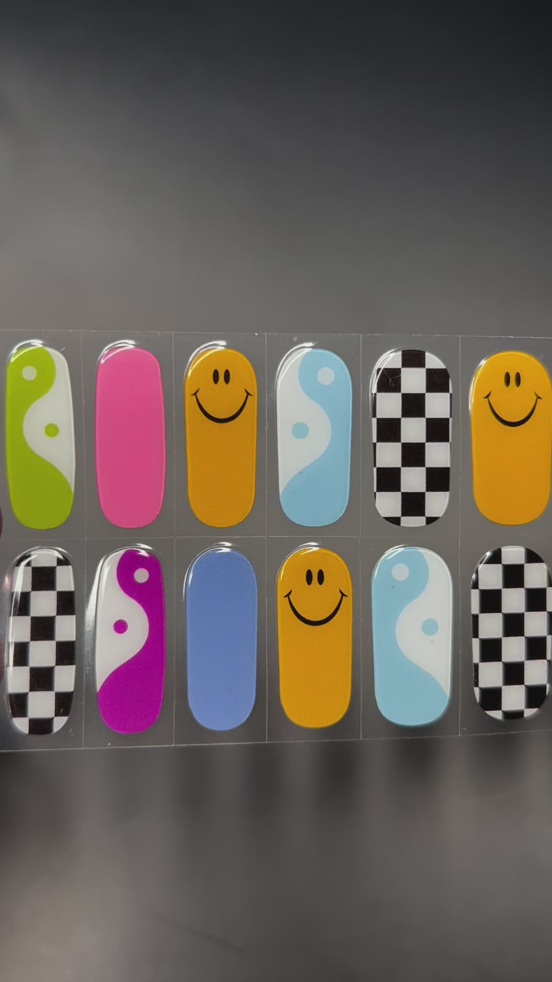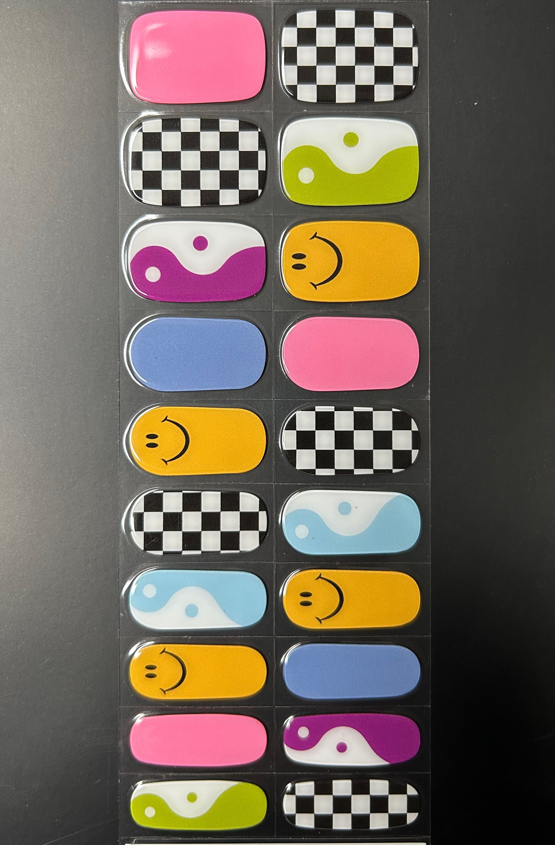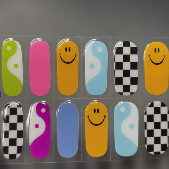 Als Set aus verschiedenen Designs und Farben kombiniert Happy Comic geometrische Muster. Symbole wie Yin-Yang, verspielte Smiley-Gesichter und klassische Elemente wie das Schachbrettmuster. Happy Comic strahlt eine Mischung aus Verspieltheit und Retro-Vibes aus und ist ideal für kreative Nagelkunst.