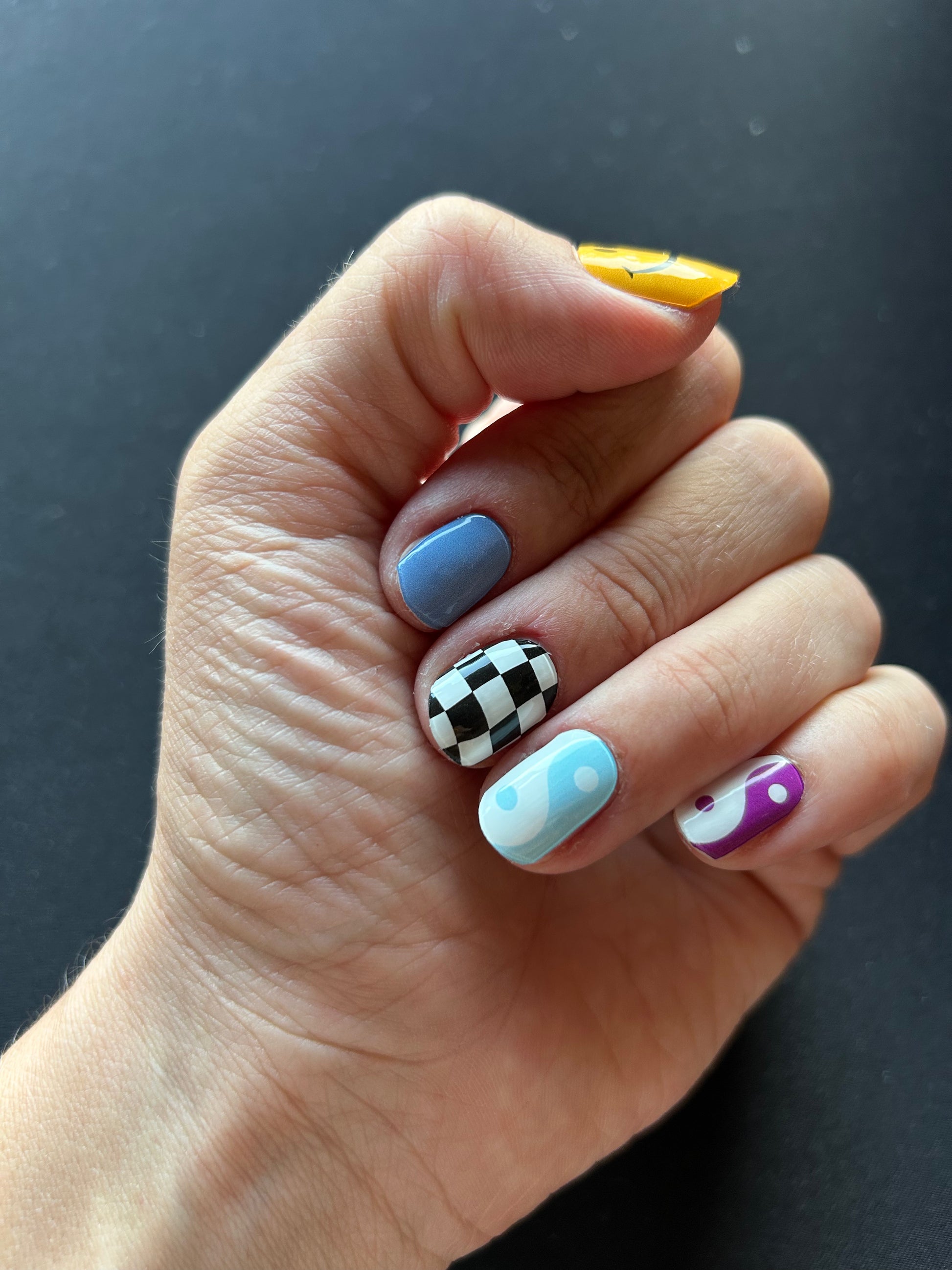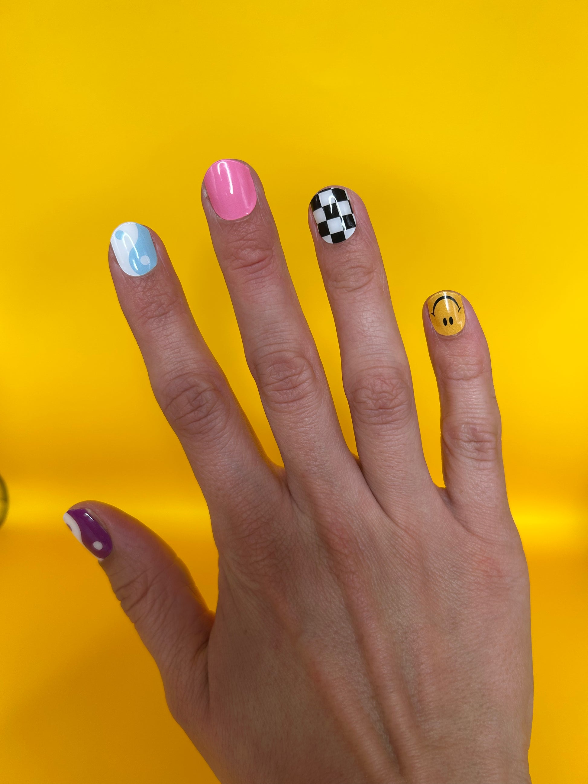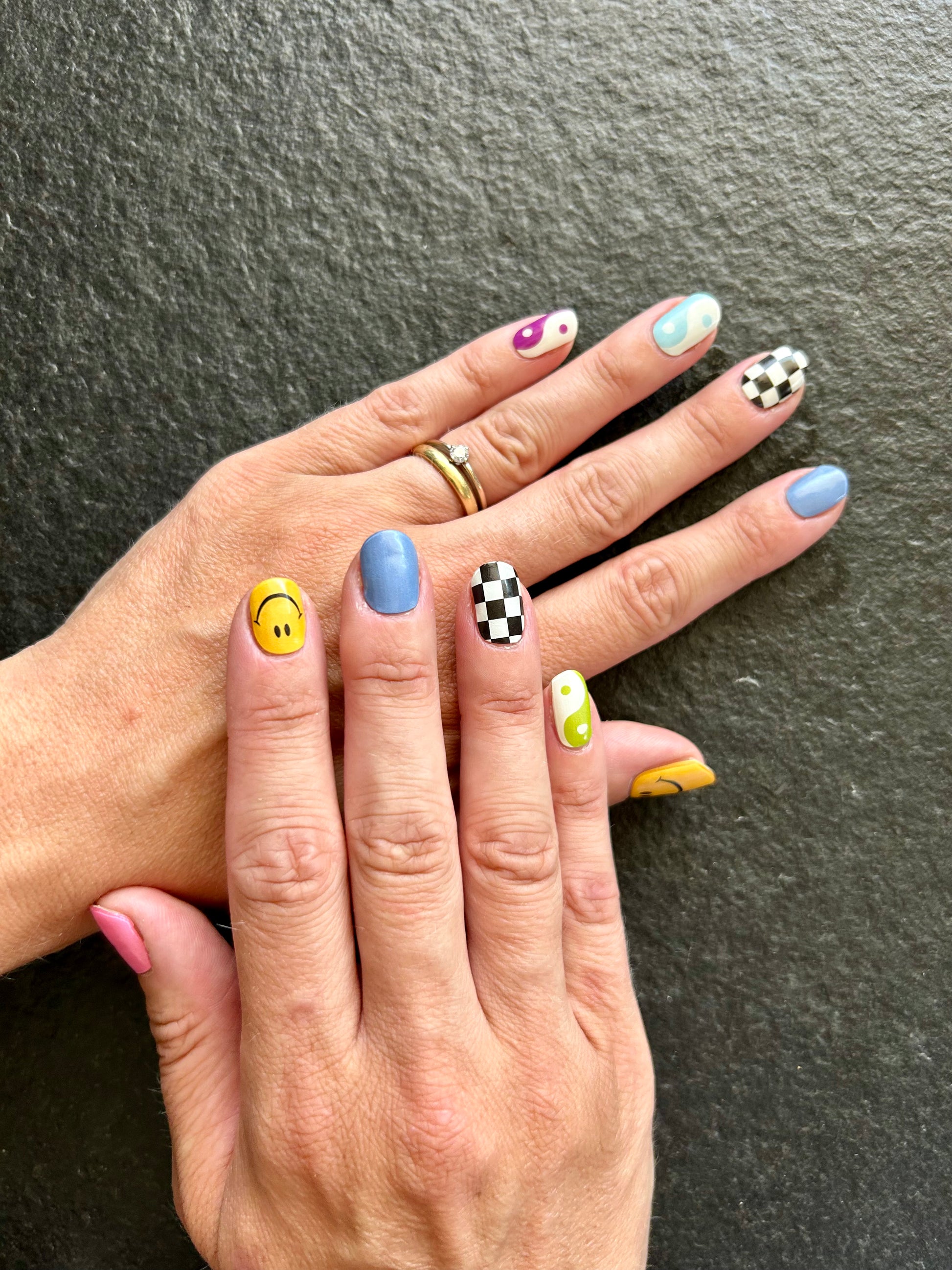 Als Set aus verschiedenen Designs und Farben kombiniert Happy Comic geometrische Muster. Symbole wie Yin-Yang, verspielte Smiley-Gesichter und klassische Elemente wie das Schachbrettmuster. Happy Comic strahlt eine Mischung aus Verspieltheit und Retro-Vibes aus und ist ideal für kreative Nagelkunst.