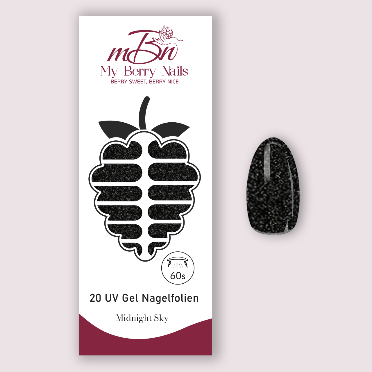 Ein tiefes Schwarz mit feinem, funkelndem Schimmer verleiht deinen Nägeln eine geheimnisvolle Eleganz. Der dezente Glitzereffekt sorgt für Tiefe und macht dieses Design ideal für festliche Anlässe oder elegante Abendlooks.
